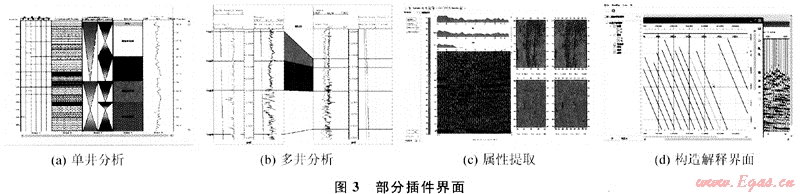井分析插件包括合成記錄、地質(zhì)層位標定、AVO分析、流體替換、交會分析等單井分析以及地層對比、砂體對比分析等多井分析功能。構(gòu)造解釋插件主要包括速度場構(gòu)建、2D/3D構(gòu)造解釋、全三維可視化解釋、時深轉(zhuǎn)換等。屬性儲層預測插件包括常規(guī)屬性及特殊屬性提取、屬性優(yōu)化、儲層預測。地質(zhì)繪圖插件包括數(shù)據(jù)網(wǎng)格化、等值線繪制、構(gòu)造成圖等功能。圖3為插件的部分界面。