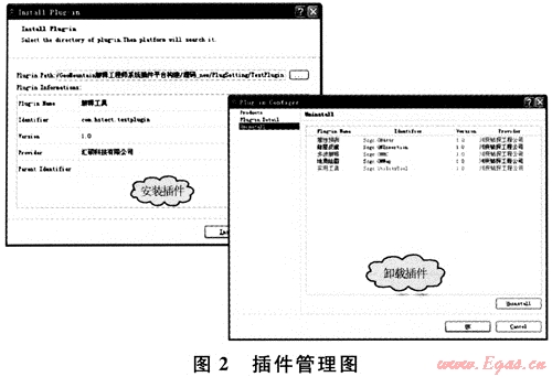 插件平臺是整個系統(tǒng)的核心,是功能插件實現(xiàn)的基礎。插件平臺包含重要的核心組件,分別有運行時核心、工作臺GUI、項目管理、幫助系統(tǒng)數(shù)據(jù)管理和平臺數(shù)據(jù)業(yè)務等。插件平臺不包含具體的功能實現(xiàn),只為功能插件提供運行環(huán)境、實現(xiàn)接口及數(shù)據(jù)管理,而插件實現(xiàn)其業(yè)務功能要依賴平臺接口。插件通過平臺安裝的方式安裝入平臺中,同時平臺也提供插件管理功能,如卸載插件等(圖2)??梢院芎玫亟鉀Q軟件開發(fā)與集成問題,適用高級版和低級版的軟件安裝,這對程序組織開發(fā)十分方便。軟件系統(tǒng)采用C++語言的跨平臺GUI工具包QT開發(fā)[2~3],可運行于Windows、Linux、Unix等多個平臺之上。