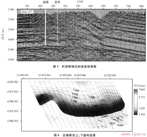 GeoMountain解釋軟件系統(tǒng)在10多個項目中得到了廣泛應用,取得較好效果。圖4為西部某工區(qū)構(gòu)建的地下速度模型,經(jīng)時深轉(zhuǎn)換后得到深度剖面。由于準確的速度場構(gòu)建,消除了時間剖面的構(gòu)造假象,恢復了地下復雜構(gòu)造的真實形態(tài)(圖5)。圖6為某層的逆掩斷層構(gòu)造成圖,它同時刻畫了斷層上、下盤包括逆掩部分的構(gòu)造形態(tài)。