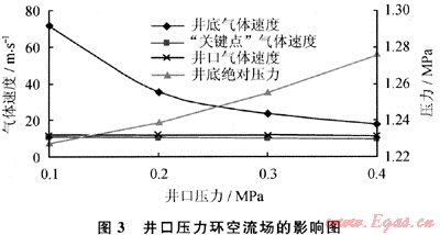 從井口壓力對(duì)環(huán)空流場的影響曲線(圖3)可以看到,井口壓力從0.1MPa增加到0.4MPa,井口、“關(guān)鍵點(diǎn)”、井底氣體速度分別減小75%、6.0%、3.8%,井底壓力增加3.99%,井口加載一定回壓后,上部井段環(huán)空流速明顯減小,削弱了夾雜固體顆粒的高速氣流對(duì)環(huán)空井壁和鉆具的沖蝕作用,而井口回壓的增加并不會(huì)明顯影響井底壓力。所以,通過在井口加載一定回壓,可實(shí)現(xiàn)對(duì)上部井段環(huán)空流場的改善。
