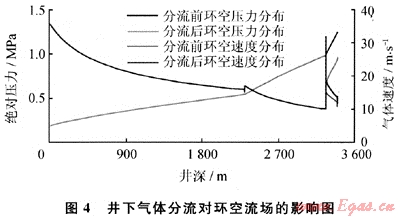 通過井下氣體分流器(DHAD)分流20m3氣體后(圖4),環(huán)空氣體分流處產(chǎn)生了約0.3MPa的局部壓降,井底壓力降低了21.2%。下部井段環(huán)空壓力降低,氣體膨脹,流速加快,攜帶巖屑能力得以提升。實(shí)現(xiàn)了改善下部井段環(huán)空流場,降低井底壓力和注氣壓力的目的。數(shù)值模擬表明采用全井段環(huán)空流場改善方法可實(shí)現(xiàn)以下目的。