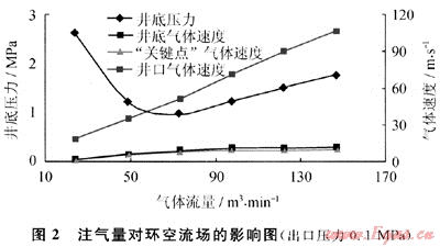 取不同注氣量對(duì)氣體鉆井環(huán)空流場進(jìn)行了數(shù)值模擬,結(jié)果表明:井底壓力隨注氣量的增加先減后增,存在一個(gè)臨界點(diǎn)(圖2)。計(jì)算條件下,注氣量從97.96m3/min增加到146.94m3/min,“關(guān)鍵點(diǎn)”、井底氣體速度僅增加4.4%和4.0%,而井口氣流速度卻增加了近5倍。所以超過一定值后,繼續(xù)增加注氣量,并不能有效提高下部井段氣流速度,從而提高下部井段井眼凈化能力,反而會(huì)導(dǎo)致上部井段沖蝕嚴(yán)重和水力能量的不必要浪費(fèi)。