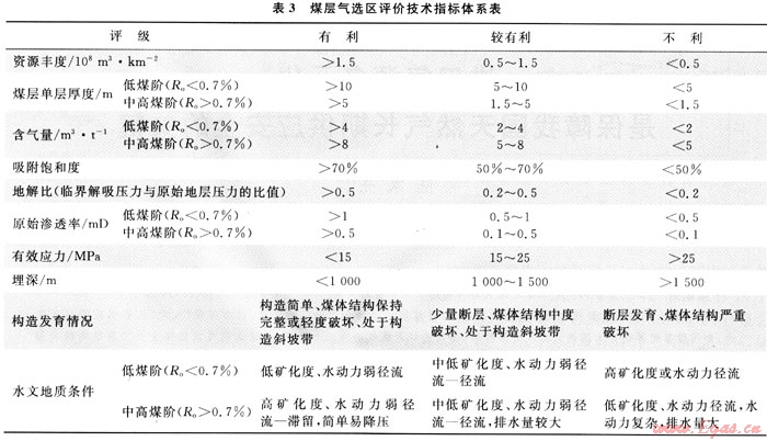 在總結(jié)煤層氣富集規(guī)律及含氣特點(diǎn)的基礎(chǔ)上,首先建立了一套不同煤階選區(qū)評(píng)價(jià)技術(shù)指標(biāo)體系(表3)。