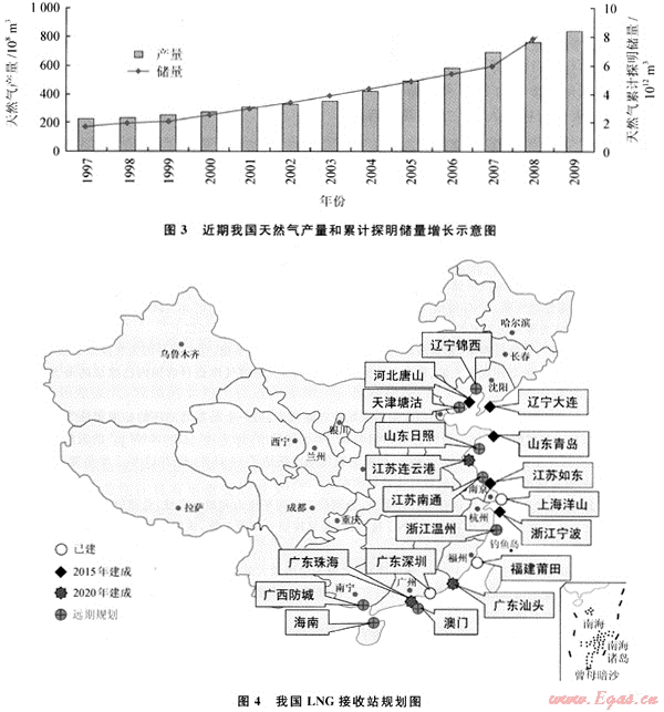 為了滿足日益增長的天然氣需求,我國還將逐步加大LNG進口力度。到目前為止,我國已建成廣東深圳LNG接收站、福建LNG接收站和上海LNG接收站,并相繼投產(chǎn)運行。按照“資源市場落實、統(tǒng)籌規(guī)劃,適時、有序、適度引進LNG資源”的原則,預計到2015年,我國LNG資源引進規(guī)模將有望突破2000×104t。我國LNG接收站規(guī)劃如圖4所示。
