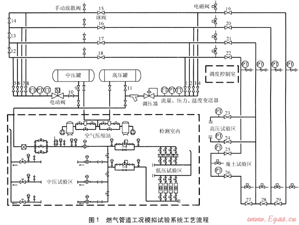 試驗(yàn)系統(tǒng)有4個(gè)試驗(yàn)區(qū),分別為高壓試驗(yàn)區(qū)(壓力為0.4~2.5MPa)、覆土試驗(yàn)區(qū)、中壓試驗(yàn)區(qū)和低壓試驗(yàn)區(qū)。高壓試驗(yàn)區(qū)和覆土試驗(yàn)區(qū)建在室外,中壓試驗(yàn)區(qū)和低壓試驗(yàn)區(qū)建在室內(nèi),與試驗(yàn)系統(tǒng)配套的小型SCADA系統(tǒng)調(diào)度中心設(shè)在調(diào)度控制室內(nèi)。燃?xì)夤艿拦r模擬試驗(yàn)系統(tǒng)工藝流程見圖1。
