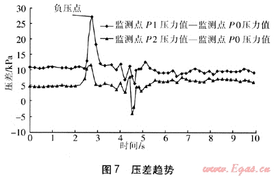 圖6為SCADA系統(tǒng)提供的壓力實(shí)時(shí)趨勢,P0是距離泄漏點(diǎn)最近的壓力測點(diǎn),P2次之,P1最遠(yuǎn)。由于負(fù)壓波傳輸需要一定的時(shí)間,P0具有明顯的負(fù)壓點(diǎn),P1和P2的負(fù)壓點(diǎn)不太明顯。圖7為壓差趨勢,通過壓差比對判定壓差波動(dòng)最大的時(shí)刻發(fā)生泄漏,泄漏位置在P0附近。在試驗(yàn)過程中,城市燃?xì)夤芫W(wǎng)泄漏在線檢測軟件同步運(yùn)行,得出的結(jié)果與試驗(yàn)實(shí)測結(jié)果對比,即可判定出軟件的準(zhǔn)確度。