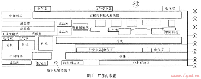 不銹鋼冷軋薄板工程占地面積約14×104m2,廠房總長(zhǎng)度為690m,總寬度為204m,由相鄰的多跨車間組成。總建筑面積為12.861×104m2,其中熱板坯車間建筑面積為14490m2,該車間不供暖。其他車間建筑面積為11.412×104m2,為供暖區(qū)域。由于供暖區(qū)域內(nèi)包括磨輥間、變電站、成品庫(kù)等不需供暖的部位,因此為簡(jiǎn)化問題,供暖面積按11×104m2考慮。不銹鋼冷軋薄板廠房設(shè)置及廠房?jī)?nèi)布置分別見圖1、2。