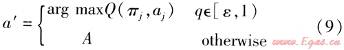 設(shè)當前狀態(tài)πj={a1,a2,a3,…,aj}下螞蟻k位于節(jié)點j,螞蟻將按照ε-貪婪規(guī)則確定在節(jié)點j′要選擇的行為a′,即以概率1-ε按貪婪策略選取當前狀態(tài)下最大Q值對應(yīng)的行為。而以概率ε隨機選擇一個當前狀態(tài)下允許行為的表達式為: