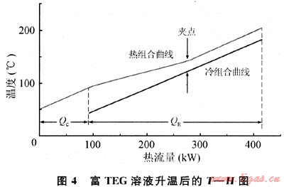 圖4為富TEG溶液升溫后的T-H圖。從圖中可以看出,物流之間的傳熱溫差明顯減少,換熱過(guò)程熱量回收量加大,公用工程冷卻量大幅減小。
