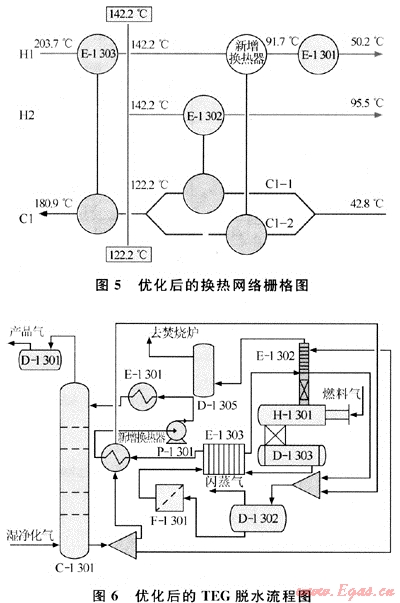 根據(jù)夾點(diǎn)設(shè)計(jì)規(guī)則[5],構(gòu)建最大能量回收換熱網(wǎng)絡(luò)(MER),將C1物流按熱容流率分成0.92kW/℃(C1-1)和1.41kW/℃(C1-2)兩股物流,C1-1物流通過(guò)換熱器E-1302與再生氣(H2)換熱到122.20℃,C1-2物流通過(guò)新增換熱器與貧TEG溶液(H1)換熱到122.20℃,然后兩股物流合并成一股通過(guò)換熱器E-1303與貧TEG溶液(H1)換熱到180.90℃,貧TEG溶液(H1)剩余熱量通過(guò)冷卻器E-1301將其溫度從91.7℃降到50.2℃。圖5、6為優(yōu)化后的換熱網(wǎng)絡(luò)柵格圖和工藝流程圖。
