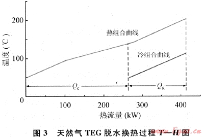 設(shè)定最小允許傳熱溫差△Tmin=20℃,圖3為天然氣TEG脫水工藝流程換熱過(guò)程溫焓(T-H)圖。
