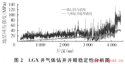 進行分析評價。利用此方法對七里北101井、龍17井及LGX井氣體鉆井井段實鉆資料驗證分析表明,當地層某點的巖石固有強度小于氣體鉆井條件下保持井壁穩(wěn)定的臨界強度時,井壁不穩(wěn)定,否則井壁處于穩(wěn)定狀態(tài)。