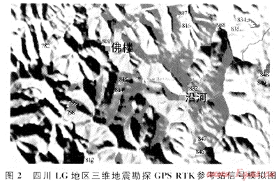 在GIS中利用數(shù)字高程模型,合理布設(shè)測量控制點,提前進行GPS基準(zhǔn)站的信號覆蓋情況模擬(圖2),并結(jié)合交通路線的分布情況,合理安排導(dǎo)線小組開始施測的位置,從而保證每個GPS施測小組在交通最方便的地方開始施測并能最大范圍地接收到來自GPS基準(zhǔn)站的GPS信號。如遇深溝或夾溝等信號盲區(qū),利用地形高差變化和交通情況,合理調(diào)配和架設(shè)中繼站,提高施測效率。