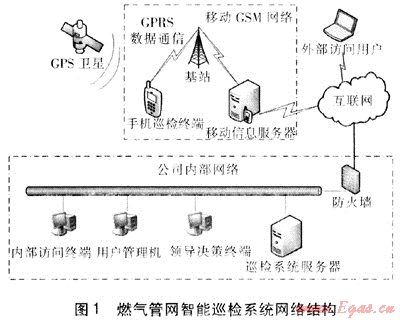 安全是企業(yè)發(fā)展永恒的話題[1~3]。如何有效地利用巡檢數(shù)據(jù)信息,消除巡檢工作過程中的安全隱患,有效提高巡檢工作質(zhì)量,是困擾燃?xì)庑袠I(yè)巡檢部門多年的問題。燃?xì)庑袠I(yè)在這個問題上進行了多方面的嘗試,例如采用條碼、IC卡、信息鈕巡更等手段,但是實際效果并不理想。主要原因是這些方法需要在現(xiàn)有的管道和設(shè)備上安裝新的巡檢設(shè)備,不僅安裝工作量巨大、成本高昂,而且由于巡檢設(shè)備多安裝在室外,受風(fēng)吹雨淋、強電磁場干擾、人為損毀等因素的影響,設(shè)備上安裝的條碼、IC卡和信息鈕等信息設(shè)備損壞嚴(yán)重,增大了巡檢工作的工作量,增加了管理成本,巡檢設(shè)備信息的不完整嚴(yán)重影響了巡檢效果。智能巡檢系統(tǒng)的出現(xiàn),徹底解決了巡檢工作中出現(xiàn)的上述問題。智能巡檢系統(tǒng)采用無線網(wǎng)絡(luò)和GIS技術(shù),不需要在巡檢設(shè)備和管道上安裝任何設(shè)備,大大降低了系統(tǒng)的采購和維護成本,有效地保證了巡檢人員巡檢質(zhì)量,可及時消除安全隱患,實現(xiàn)管網(wǎng)巡檢工作的信息化管理。北京市燃?xì)饧瘓F有限公司在這方面已作了不少嘗試[4、5],鞍山市燃?xì)饪偣疽苍谶@方面進行了初步探索。