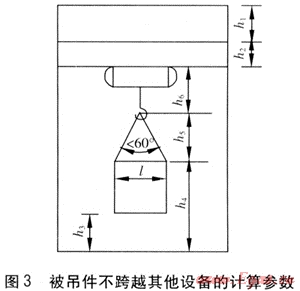 對(duì)于被吊件跨越其他設(shè)備的情況,起升高度需滿足被吊件底部距其所跨越設(shè)備頂部的距離不小于500mm,計(jì)算參數(shù)見(jiàn)圖4。