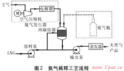 利用氮氣稀釋是調(diào)節(jié)熱值的重要手段,也是傳統(tǒng)的重烴去除工藝之一,氮氣稀釋工藝流程見圖2。原料LNG經(jīng)原料泵增壓后進入再凝結(jié)器,在再凝結(jié)器中與氮氣(從空氣中提純或取自氮氣瓶)混合,再經(jīng)輸出泵增壓,經(jīng)蒸發(fā)器輸出。氮氣稀釋工藝中的輸出泵壓縮過程為液體壓縮,相比蒸餾塔分離工藝中的氣體壓縮,可以節(jié)省大量的電能,但是增加了昂貴的氮氣發(fā)生器或氮氣供應系統(tǒng)。此外,如果氮氣的溫度不夠低,LNG與N2的混合過程和液體壓縮過程中將會產(chǎn)生大量的熵增。