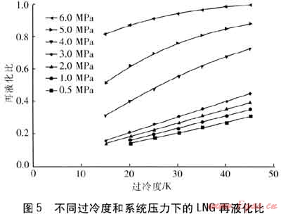 ③ 通過HYSYS軟件模擬,認為LNG再液化工藝是可行的,得出了再液化比與過冷度、系統(tǒng)壓力的關系,有力地論證了理論分析的合理性。