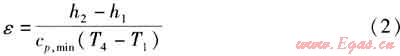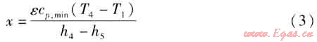 由式(3)可知再液化比x與熱交換器效率ε成正比。原料流的比定壓熱容通常小于回流的比定壓熱容,因為大多數(shù)原料流只承載著顯熱,而回流還承載著相變過程中的潛熱。原料流的比定壓熱容大于回流的比定壓熱容只會發(fā)生在再液化比很小的情況下,而這種情況與重烴去除工藝的目的相矛盾。因此原料流的比定壓熱容為最小比定壓熱容。