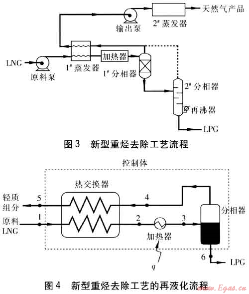 本文提出一種不同于以往的新型重烴去除工藝:將過冷態(tài)LNG的冷能用于凝結(jié)從分相器內(nèi)重組分中蒸餾分離出來的輕質(zhì)LNG組分[1]。目前LNG的冷能利用[2~7]主要有:冷能發(fā)電、空氣分離、冷凍倉庫、液化二氧化碳、熱電循環(huán)等。本文將冷能的應用范圍擴大至再液化流程。