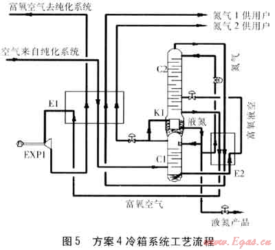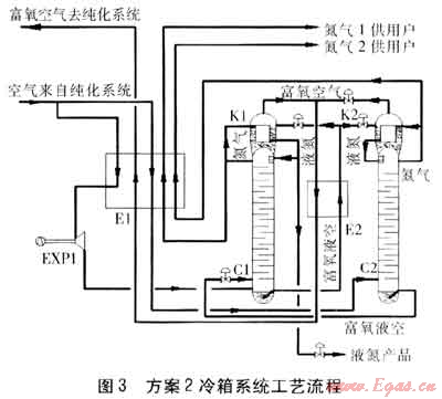 在C1底部產(chǎn)生的富氧液空經(jīng)E2過(guò)冷,節(jié)流后進(jìn)入C2進(jìn)行二次精餾,得到產(chǎn)品氮?dú)饨?jīng)E2、E1復(fù)熱后作為氮?dú)?供用戶。得到富氧空氣經(jīng)E2復(fù)熱,進(jìn)入E1被復(fù)熱到約-145℃后,送入EXP1膨脹制冷后,返回E1被復(fù)熱后,送入純化系統(tǒng)。