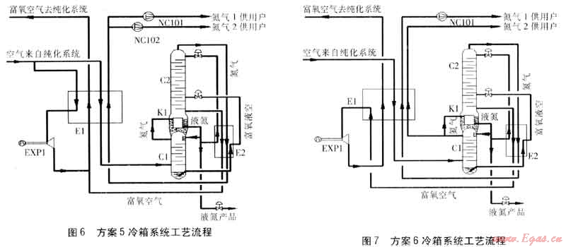 此方案采用兩塔精餾,正流膨脹。主要配置為主換熱器(E1)、精餾塔(C1)、冷凝蒸發(fā)器(K1)、過(guò)冷器(E2)、膨脹機(jī)(EXP1)、精餾塔(C2)、冷凝蒸發(fā)器(K2)、空氣增壓機(jī)(AC101)。流程的特點(diǎn)是:氮?dú)?直接由C1抽取并經(jīng)E1復(fù)熱獲得,氮?dú)?直接由C2抽取并經(jīng)E1復(fù)熱獲得。