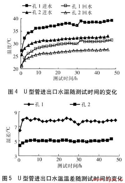 孔1、2進(jìn)出口水溫、進(jìn)出口水溫溫差隨測(cè)試時(shí)間的變化分別見(jiàn)圖4、5。