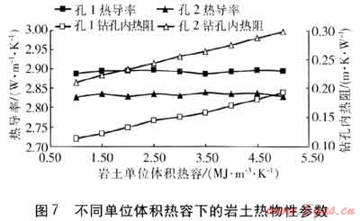 ④ 基于線熱源模型和雙參數(shù)估計(jì)法,巖土的單位體積熱容對(duì)熱導(dǎo)率幾乎沒(méi)有影響,對(duì)鉆孔內(nèi)熱阻有一定影響。