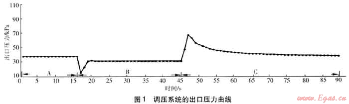 緩沖管道容積的設(shè)置通常有兩種方法:一種是過盈計(jì)算方法,需結(jié)合供氣電磁閥的開啟時(shí)間、噴火設(shè)備的用氣量、噴火設(shè)備的熄火壓力、調(diào)壓系統(tǒng)的響應(yīng)時(shí)間和調(diào)壓器的流量系數(shù)等綜合計(jì)算,并考慮一定的管道容積余量。另一種是實(shí)驗(yàn)驗(yàn)證方法,即在實(shí)驗(yàn)室模擬實(shí)際情況來驗(yàn)證管道容積是否能滿足使用要求。例如:在香港海洋公園大型噴火項(xiàng)目中,已知噴火設(shè)備的最大用氣量為6000m3/h,受場(chǎng)地限制,噴火設(shè)備下游為長(zhǎng)30m、公稱直徑為250mm的緩沖管道。為驗(yàn)證此管道容積是否能滿足使用要求,特進(jìn)行實(shí)驗(yàn)驗(yàn)證。通過在上海飛奧燃?xì)庠O(shè)備有限公司閥門與調(diào)壓實(shí)驗(yàn)室進(jìn)行的模擬試驗(yàn),得到了調(diào)壓系統(tǒng)的出口壓力曲線,見圖1中的A、B段。