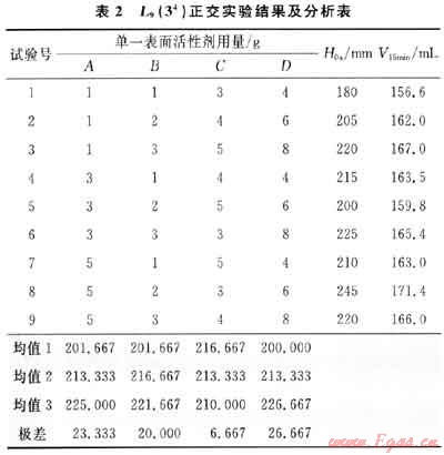 為進(jìn)一步研究單一表面活性劑之間的復(fù)配效果,找出最佳的優(yōu)化配比,選擇單一表面活性劑起泡能力和攜液能力較好的L-1(A)、甜菜堿(B)、銨鹽(C)和L-2(D)進(jìn)行優(yōu)化實驗。在優(yōu)化實驗中,采用正交設(shè)計實驗方法,選取4因素3水平,正交表L9(34)對實驗方案進(jìn)行優(yōu)化研究,然后采用直觀分析法對測定的數(shù)據(jù)進(jìn)行處理,可得到LYB-1型泡排劑的最佳配比,實驗結(jié)果見表2。實驗泡排劑溶液濃度為0.5%,總液體量為200mL,地層水礦化度為4.7×104mg/L,水型為CaCl2型,試驗溫度為30℃。
