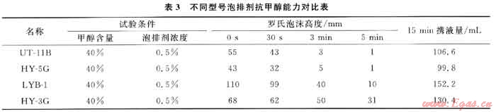 為了充分說明泡排劑LYB-1具有較強(qiáng)的抗甲醇能力,30℃時將該泡排劑與現(xiàn)場應(yīng)用較多的泡排劑UT-118、HY-5G和HY-3G進(jìn)行了對比,試驗結(jié)果見表3。表3數(shù)據(jù)表明,泡排劑LYB-1具有較強(qiáng)的抗甲醇能力,明顯優(yōu)于其他3種泡排劑。