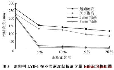 從圖3可以看出,在30℃時,不含凝析油地層水的泡沫起泡性能最好,起始泡高最高為265mm,5min后降到215mm。但隨著凝析油含量的增加,凝析油的消泡作用逐漸增強(qiáng),泡沫高度均逐漸降低。當(dāng)凝析油含量達(dá)到上限20%時,泡沫的起始泡高仍能達(dá)到116mm,3min后降低到10mm,但仍能滿足天然氣開采的要求。由圖2可以看出,隨著凝析油含量的增加,泡沫攜液量都逐漸減少,當(dāng)凝析含油量為20%時,泡沫攜液量仍能達(dá)到103.6mL。以上數(shù)據(jù)表明泡排劑LYB-1具有良好的抗凝析油能力。