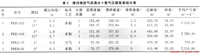 潘河煤層氣田共鉆井150口,其中的147口井進(jìn)行了壓裂增產(chǎn)改造,改造類型包括活性水加砂壓裂、氮?dú)馀菽瓑毫?、清?氮?dú)鈮毫?、清水壓裂?6口井采用活性水?dāng)y砂壓裂技術(shù);2口井(PH1和PH1-006井)采用氮?dú)馀菽瓑毫鸭夹g(shù),4口井采用清水+氮?dú)鈮毫鸭夹g(shù),107口井采用清水加砂壓裂技術(shù)。其中PH1-002和PH1-009的30、15#煤層分別采用了不同的壓裂技術(shù)。