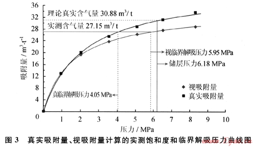 計算結(jié)果表明:真實吸附量情況下的臨界解吸壓力和實測飽和度要小于視吸附量情況下的臨界解吸壓力和實測飽和度,視吸附量情況下的臨界解吸壓力為5.95MPa,而真實吸附量情況下的臨界解吸壓力為4.05MPa,兩者相差1.90MPa。