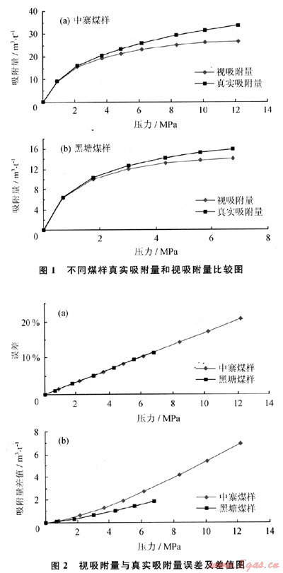 結(jié)果顯示(圖1、2):在相對低壓范圍(0~2MPa),視吸附量和真實吸附量差別較小,誤差小于5%,差值小于1m3/t。這與一些研究者在低壓范圍內(nèi)進行液氮吸附實驗得出的數(shù)據(jù)一致,即真吸附量和視吸附量基本沒有差別閻。