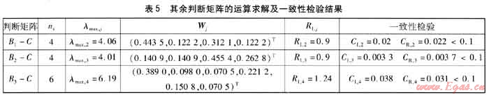 當(dāng)CR,1<0.1時(shí),說(shuō)明此時(shí)判斷矩陣有可以接受的一致性。其余判斷矩陣(表2~4)的運(yùn)算求解及一致性檢驗(yàn)見(jiàn)表5。