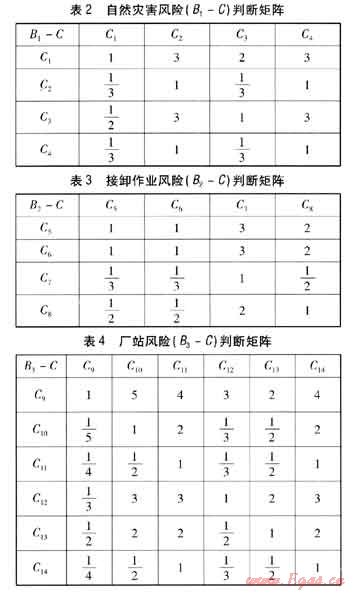 同樣,可以構(gòu)建以具體指標(biāo)層C的元素C1、C2、C3、…、C14相對(duì)于B層各指標(biāo)的兩兩對(duì)比判斷矩陣,詳見(jiàn)表2~4。元素兩兩對(duì)比的重要性采用1~9標(biāo)度法[8],并寫(xiě)成判斷矩陣形式。構(gòu)造判斷矩陣后,即可通過(guò)計(jì)算判斷矩陣的最大特征值及其對(duì)應(yīng)的權(quán)重向量,也就是計(jì)算出某一層次的各個(gè)元素對(duì)于上一層次某一個(gè)元素的相對(duì)重要性權(quán)重。在計(jì)算出某一層次元素相對(duì)于上一層次各個(gè)因素的單排序權(quán)重后,用上一層次因素本身的權(quán)重加權(quán)綜合,即可計(jì)算出C層各因素相對(duì)于4層的層次總排序的權(quán)重。此外,為了評(píng)價(jià)經(jīng)所構(gòu)造的判斷矩陣求出的最大特征值及其對(duì)應(yīng)的權(quán)重向量是否合理,需對(duì)判斷矩陣進(jìn)行一致性隨機(jī)檢驗(yàn)[9~10],檢驗(yàn)各個(gè)專(zhuān)家對(duì)各指標(biāo)相對(duì)權(quán)重判斷的邏輯是否順暢。