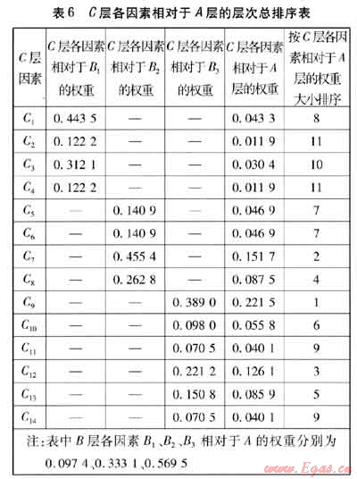 可見(jiàn),C層各因素相對(duì)于A層層次總排序的計(jì)算結(jié)果滿足一致性,否則,需要重新調(diào)整判斷矩陣,直至滿足一致性。