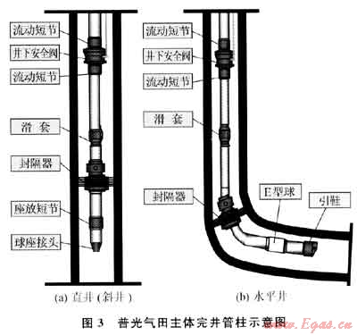 針對氣田硫化氫分壓高、生產(chǎn)井段長及儲層非均質(zhì)性強的特點,模擬普光氣田的工況條件,進行不同材質(zhì)腐蝕評價實驗,優(yōu)化設(shè)計配套了生產(chǎn)完井一體化管柱(圖3),進行雙向雙效、多級壓力延時起爆技術(shù)攻關(guān),開展抗硫耐溫酸液體系、多級注入+閉合酸壓及暫堵工藝研究,有效地改造了Ⅱ、Ⅲ類儲層,提高了氣藏的動用程度和單井產(chǎn)能[8]。