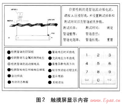 ④ 顯示模塊:顯示模塊選用221.4mm×124.5mm壓電式觸摸液晶顯示屏,主要顯示數(shù)據(jù)采集過程的狀態(tài)值和最終處理值,并實(shí)現(xiàn)人性化的觸摸動(dòng)作指令。其顯示任務(wù)有顯示管道的陰陽極、管道與金屬構(gòu)筑物的電位、管道流動(dòng)的微電流、管地電位和地電位梯度、自動(dòng)排流的狀態(tài)數(shù)據(jù)、管地電位-時(shí)間曲線、交流電位-時(shí)間曲線、雜散電流方向、無線發(fā)送短信狀態(tài)、顯示幫助等。顯示分為4個(gè)區(qū)域,左上角顯示各功能模塊的原理及原理圖,右上區(qū)域顯示設(shè)置值和狀態(tài)值,左下區(qū)域?yàn)轱@示內(nèi)容選單,右下區(qū)域?yàn)殒I盤。顯示內(nèi)容示例見圖2。