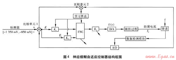 圖4中,F(xiàn)NC表示神經(jīng)模糊自適應(yīng)控制器,A/D表示模數(shù)轉(zhuǎn)換器,D/A表示數(shù)模轉(zhuǎn)換器,Ke表示偏差系數(shù),Kec表示偏差變化率系數(shù),E表示偏差,Ec表示偏差變化率,Ku表示防腐調(diào)整系數(shù),Ip表示實(shí)際防腐電流,f表示干擾信號(hào)。干擾信號(hào)f來源于大地磁場的波動(dòng)、土壤的濕度和松緊度變化、季節(jié)的變更以及野外強(qiáng)電電位突變等。干擾信號(hào)的出現(xiàn),將影響鋼質(zhì)管道管地電位的檢測值且改變管道的腐蝕狀況。