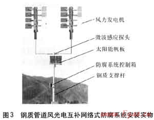 為操作簡單化和防止人為破壞,每臺(tái)鋼質(zhì)管道風(fēng)光電互補(bǔ)網(wǎng)絡(luò)式防腐系統(tǒng)安裝在高度為7m的鋼質(zhì)支撐桿上,距地面不得低于5m,其安裝實(shí)物用見圖3。