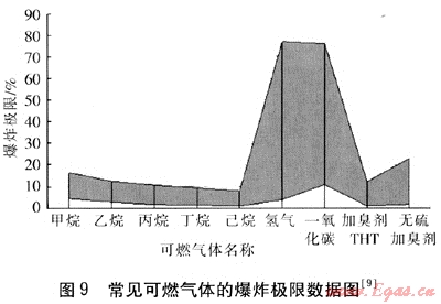 由于可燃?xì)怏w種類很多而性質(zhì)差異很大,為統(tǒng)一地描述其爆炸特性,通常采用爆炸極限這一參數(shù)。特別需要指出的是,某種可燃?xì)怏w的爆炸極限的值是通過實(shí)驗(yàn)得到的客觀恒定值。圖9是常見可燃?xì)怏w的爆炸極限數(shù)據(jù)圖[9],表5是常見可燃?xì)怏w的爆炸極限數(shù)據(jù)表[9]。