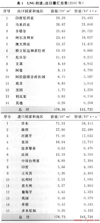 2003年全球天然氣消費(fèi)量為2.6×1012m3/a,至2006年持續(xù)以1.8%的比例增加,其后又以每年2.8%的比例增長,預(yù)計(jì)2025年全球天然氣消費(fèi)量將達(dá)5.1×1012m3/a。在天然氣貿(mào)易量中有7%是通過LNG的方式來進(jìn)行的,表1反映了世界LNG進(jìn)出口國家和地區(qū)的進(jìn)出口量[1]。