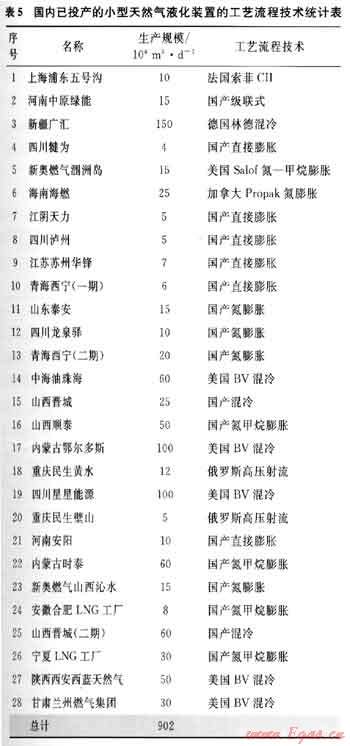 我國已建成投產(chǎn)的LNG工廠中,一部分采用了國外的流程工藝技術(shù),如美國的B&V、Salof、ACPI,法國的Sole,德國的Linde等;另一部分則采用了國內(nèi)自行開發(fā)的技術(shù),如河南中原綠能高科有限責(zé)任公司、成都深冷空分設(shè)備工程有限公司、中國科學(xué)院理化技術(shù)研究所等的流程工藝。目前,國產(chǎn)液化工藝包日趨成熟,單條生產(chǎn)線的規(guī)??蛇_(dá)60×104m3/d(LNG年產(chǎn)量為16×104t)。國內(nèi)已投產(chǎn)的小型天然氣液化裝置的工藝流程技術(shù)統(tǒng)計(jì)情況如表5所示[4]。