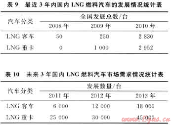 近年來,我國LNG燃料汽車已進(jìn)入了快速發(fā)展通道,在短短的3年時(shí)間內(nèi),國內(nèi)已經(jīng)有新疆、山西、內(nèi)蒙古等地的LNG重型卡車及北京、杭州、深圳、烏魯木齊、昆明、???、湛江、張家口等城市LNG公交相繼投入了運(yùn)行,而且這一城市群體還在迅速擴(kuò)大,充分說明了LNG燃料汽車的技術(shù)已經(jīng)完全成熟、節(jié)能減排優(yōu)勢(shì)明顯。表9、10分別反映了最近3年內(nèi)國內(nèi)LNG燃料汽車的發(fā)展情況及未來3年汽車市場(chǎng)需求情況[5]。