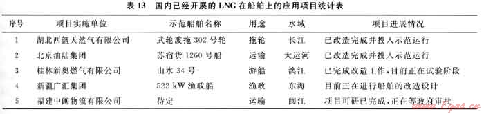 2009年4月,全球首套LNG船用燃料儲(chǔ)存供氣系統(tǒng)由張家港富瑞特種裝備股份有限公司下屬的控股子公司張家港韓中深冷科技有限公司研發(fā)試制成功并順利交付客戶挪威漢姆沃斯公司。同時(shí),在國內(nèi)LNG船舶油改氣項(xiàng)目也有了長足的發(fā)展。截至目前,已經(jīng)先后有湖北西籃、北京油陸、桂林新奧燃?xì)狻⑿陆畯V匯、福建中閩等多家能源企業(yè)為了搶占LNG在船舶領(lǐng)域的應(yīng)用市場(chǎng)而開展了船舶燃料油改氣示范項(xiàng)目的運(yùn)作(表13)。