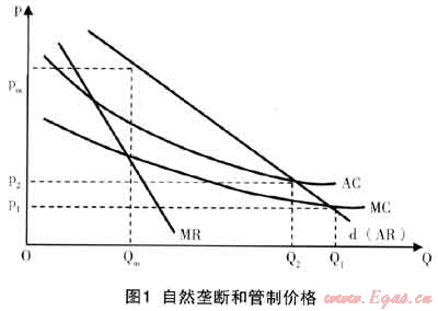 如圖1所示,其中,P表示價格,Q表示產(chǎn)量,d表示需求曲線。在市場上只有一家供貨者來說,市場需求曲線等于單個壟斷廠商所面臨的需求曲線。當價格下降時(同時其他條件不變),市場上對產(chǎn)品的需求是增加的。在無管制的情況下,壟斷企業(yè)根據(jù)MR(邊際收益)=MC(邊際成本)的原則確定的產(chǎn)量為Qm,價格為Pm,價格顯然高于邊際成本,此時壟斷企業(yè)利潤最大化。在政府管制的情況下,按照邊際成本定價法即P=MC,企業(yè)的價格下降為P1,產(chǎn)量增加為Q1。但隨之而來的問題是,由于自然壟斷廠商是在AC曲線下降的規(guī)模經(jīng)濟段進行生產(chǎn),所以,MC曲線位于AC曲線的下方。即是說,按照邊際成本MC所決定的價格P1一定小于平均成本AC。因此,在這種情況下,企業(yè)是虧損的,企業(yè)會退出生產(chǎn),或者犧牲必需的成本來降低平均成本,但會降低服務(wù)質(zhì)量。