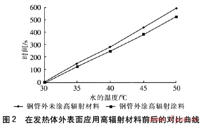 測(cè)試平臺(tái)如下:一個(gè)長600mm、寬600mm、高480mm的鐵皮箱,外表覆蓋保溫棉,內(nèi)部以石英加熱管作為熱源,在石英加熱管外部套上鋼管,鋼管受熱后,加熱旁邊的水杯。采用兩種測(cè)試方案,第一種方案是在鋼管外部涂刷高輻射材料,記錄杯中水的溫升隋況,另一種方案是鋼管外部不涂刷高輻射材料,杯內(nèi)放同樣質(zhì)量的水,記錄水的溫升情況。多次測(cè)量后,取平均值。在發(fā)熱體外表面應(yīng)用高輻射材料前后的對(duì)比曲線見圖2。