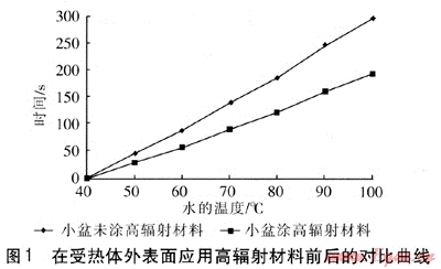 測(cè)試平臺(tái)如下:兩個(gè)一樣的不銹鋼小盆,直徑為160mm,一個(gè)在盆底涂刷高輻射材料,另一個(gè)不涂,小盆裝相同的水,在相同的電爐上測(cè)試水的升溫時(shí)間,多次測(cè)量后,取平均值。在受熱體外表面應(yīng)用高輻射材料前后的對(duì)比曲線見圖1。