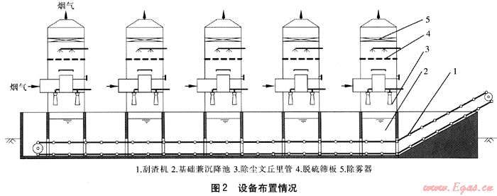 脫硫除塵裝置安裝在原除塵器的位置,底部基礎(chǔ)兼做沉降池,在池底安裝刮渣機,5臺雙循環(huán)煙氣脫硫除塵裝置基礎(chǔ)連通,共用一臺刮渣機,沉降的灰渣經(jīng)刮渣機的框鏈集中運輸?shù)交覉?。雙循環(huán)脫硫除塵裝置總阻力比原除塵器僅增加500Pa,因此可保留原引風(fēng)機。增加一個除塵水循環(huán)池和一個堿液循環(huán)池,除塵水循環(huán)池與沉降池連通,除塵水循環(huán)泵將除塵水通過噴頭送入文丘里管與煙氣混合,在喉口處煙塵與液滴充分混合,煙塵被加濕?;咚倭鞒鑫那鹄锕芎鬀_擊液面,被液面捕集,灰渣沉降于池底被刮渣機清除,清液流回除塵水循環(huán)池循環(huán)使用。堿液循環(huán)泵將堿液送入脫硫塔,在篩板上與除塵后的煙氣混合形成流化床,煙氣中的二氧化硫被吸收,脫硫后的煙氣經(jīng)除霧器脫水后排出,脫硫后的堿液經(jīng)排液口流回堿液循環(huán)池調(diào)整pH值后循環(huán)使用。設(shè)備外部堿液循環(huán)管道和除塵水循環(huán)管道均采用UPVC工程塑料管。